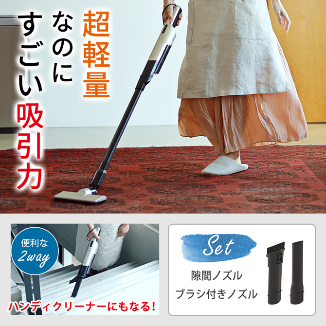 電源コードがない「コードレス」かつ総重量が「約900g (本体+延長パイプ+フロアヘッド装着時)」と驚くほど軽いから、場所を選ばず気付いた時にサッとお掃除ができます。