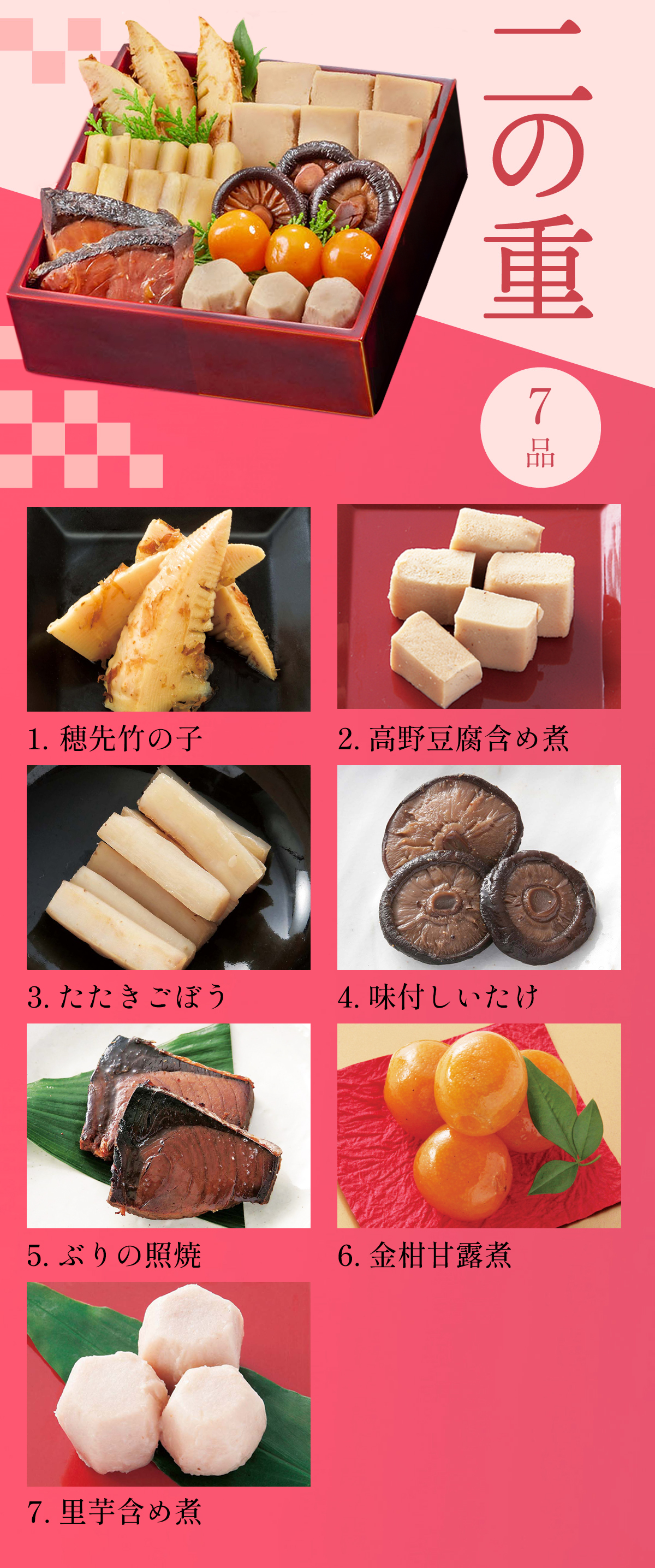 穂先竹の子、ぶりの照焼、金柑甘露煮など。