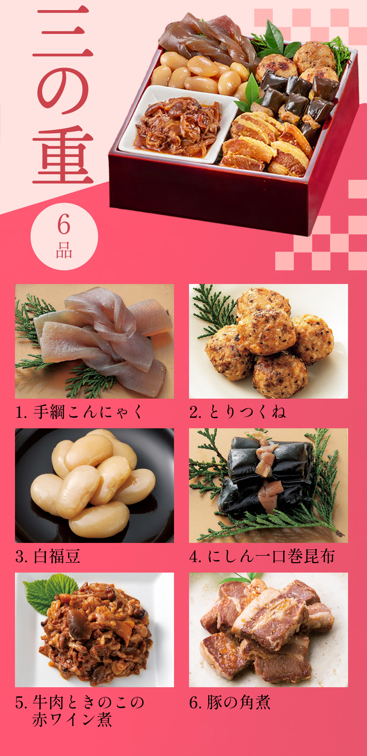 とりつくね、にしん一口巻昆布、豚の角煮など。