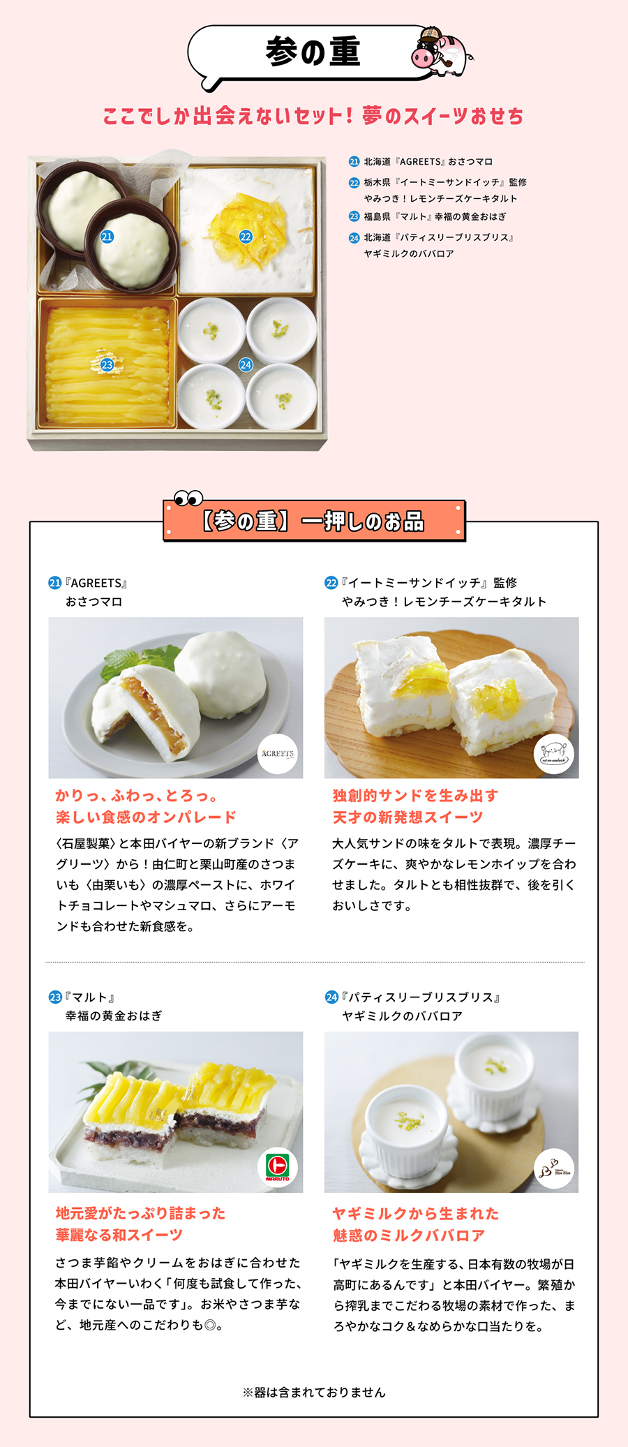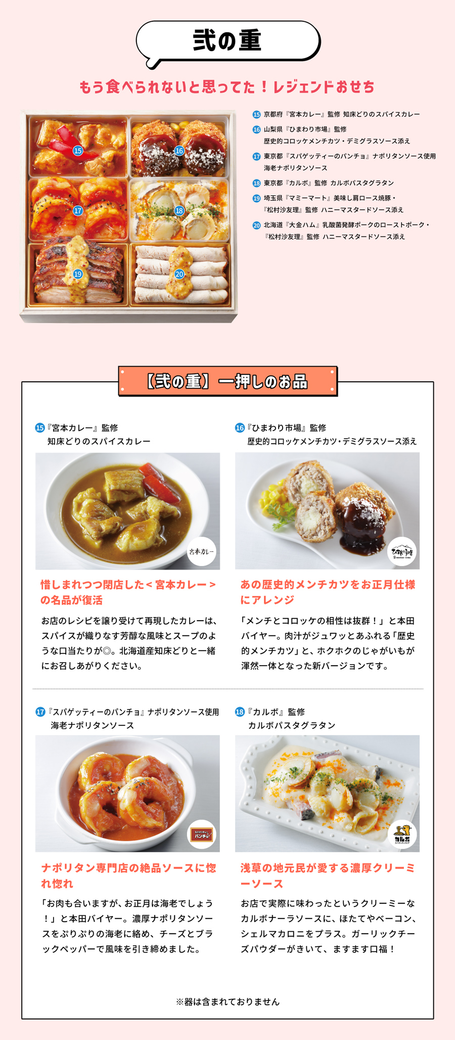 全国の美味を集めただけでなく、"北のグルメハンター"の異名を持つバイヤー 本田大助がお店や生産者の方々と試行錯誤を重ねて作り上げた“オンリーワン”おせちの第2弾。