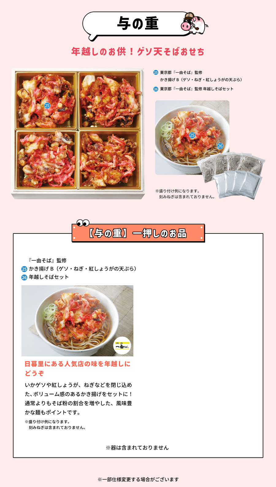 バラエティ豊かな品々に加え、大晦日から楽しんでいただけるよう、番組ゆかりの日暮里『一由そば』から年越しそばセットとボリュームたっぷりのかき揚げが付いた、計26品目をお届けします。