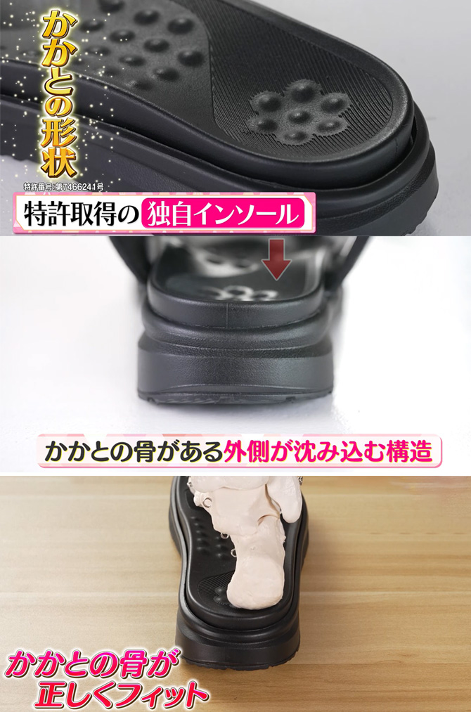 そこで、かかとの真ん中ではなく、かかとの骨がある外側が沈み込む特許取得(※)の独自インソールを採用。