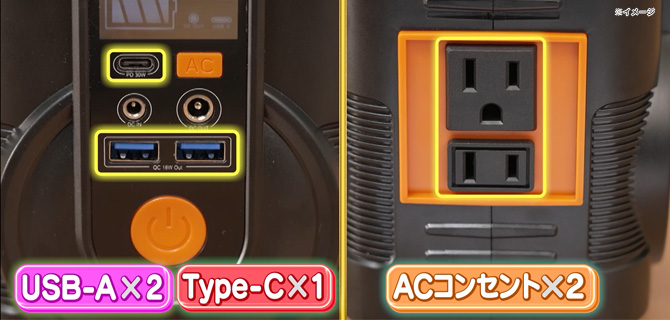 スマホの充電に便利なUSB-Aが2口、type-cが1口。さらに、ACコンセントが2口ついています。