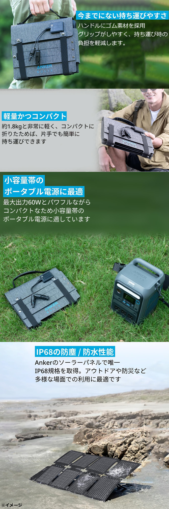 MC4出力ポート搭載かつスタンド付きの出力60W以上のソーラーパネルにおいて ( 2024年9月Anker調べ )世界最小サイズを実現した60Wソーラーパネル!